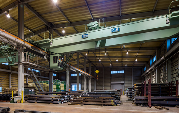 北関東自動車道 波志江スマートインターから3分の場所に位置し製品の保管、分束、鋼材の反転(90度)、出荷までを対応。取扱量は月間6,000tに及び、在庫管理システムにて分束後の鋼材まで管理している。